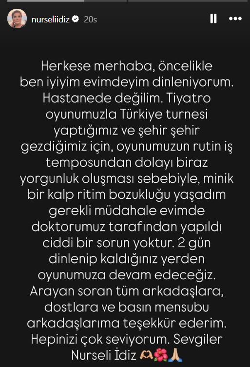 Nurseli İdiz, kısa bir dinlenme sürecinin ardından yeniden sahnelere döneceğini de paylaştı. Oyuncu, “İyiyim, evimde dinleniyorum. Küçük bir ritim bozukluğu yaşadım ancak kontrol altına alındı. İki gün dinlenip oyunumuzla kaldığımız yerden devam edeceğiz” dedi.